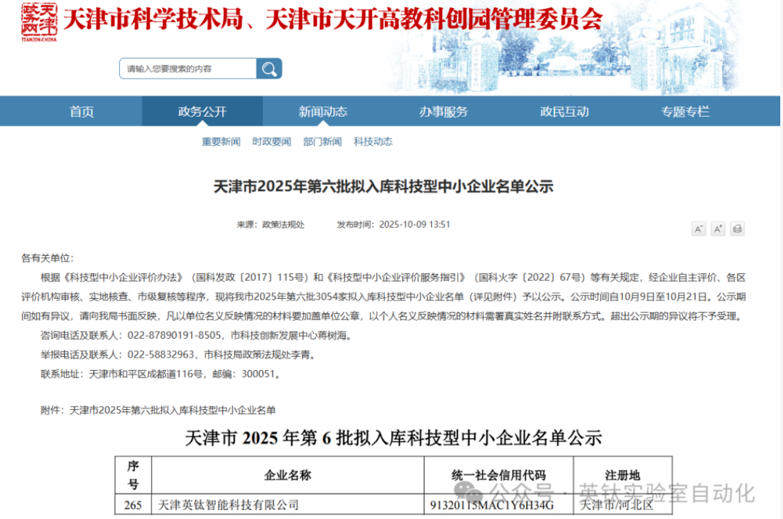 近日,天津市科学技术局、天开高教科创园管理委员会正式发布《2025年第六批拟入库科技型中小企业名单》。天津英钛智能科技有限公司(以下简称“英钛智能”)经过层层筛选与严格评审,凭借突出的技术创新能力、成果转化实绩及未来发展潜力等方面的综合优势成功入库。此次入库不仅是一张“官方认证”的荣誉证书,更是一份沉甸甸的认可——标志着英钛智能在科技创新赛道上的不懈努力得到了权威部门的充分肯定,为公司未来的高质量发展注入了强劲的“官方动能”。
